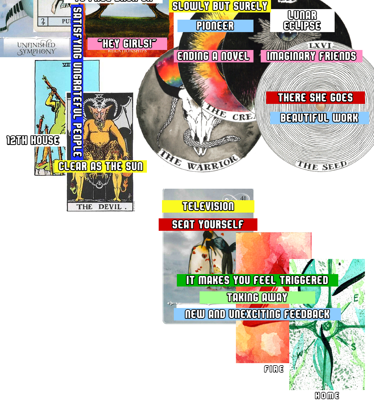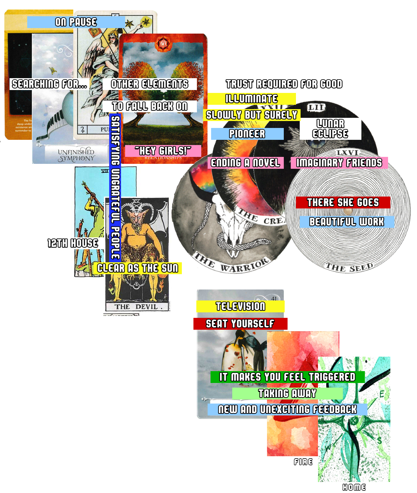 The “hey girls!” Sprinkle is one that I wrote down while imagining a slumber party with young girls playing with a ouija board, where a spirit, knowing full well they were going to freak the girls out, just pops up and says, “hi!” It’s meant to represent an unexpected visitor or a surprise visitor, but here, it was registering as something just a bit heavier. With this Sprinkle over Relationships, it felt more like a situation where, in middle school or high school, there is a group of girls talking shit about another girl and that girl over hears them, pops up behind them, and with a very sharply sarcastic smile and cheery tone says, “oh, hey girls!”
