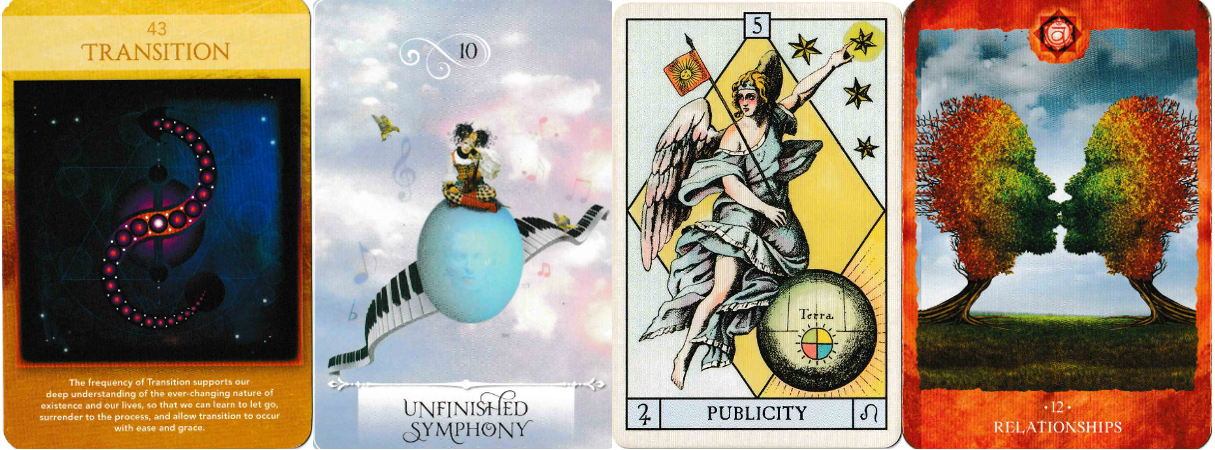With the cards alone, Transition and Unfinished Symphony are a reference to the past life being “reinstalled” and that purpose work continuing on. I was very focused on the number 10 in Unfinished Symphony and the halting feeling of it hitting number 5 in Publicity. There is a clear separation between these two cards, with Publicity and Relationships carrying a weight that pulls a lot of the energy downward, implying that Publicity and the relationships connected to this, which would be the media, the general public, and fans, has the potential to halt or corrupt this new system as it was able to collapse the previous one. The soul is very aware of this and seems to be very pissed off about it.