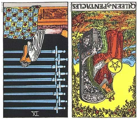 State of The Subconscious Mind: 9 of Swords (rev.) + Queen of Pentacles (rev.)