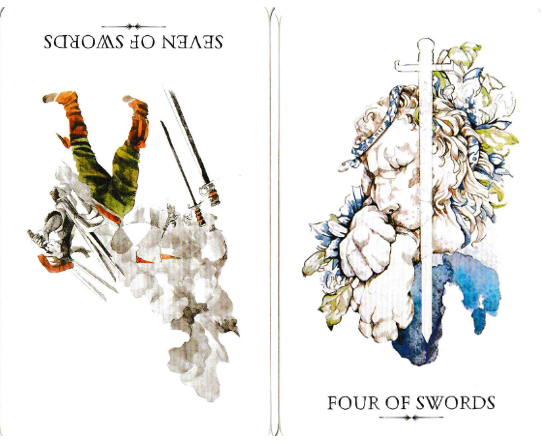 Seven of Swords (rev.) + Four of Swords