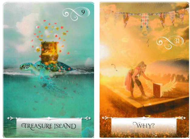 Treasure Island on Connor’s side is projecting this “in with the Water” sort of delivery of bright, vibrant energy, very Pisces/Leo/Sun energy. The treasure he brings is a creative inspiration, a literal treasure chest of creativity. The Why? card on Hudson’s side, especially with the book in the image having wings, is an “in with the Air” curiosity, a pondering, that mood-shifting energy that gets people talking and wanting to figure him out, figure out what he’s talking about or showing. It’s really so spot on with what I was seeing for them energetically.
