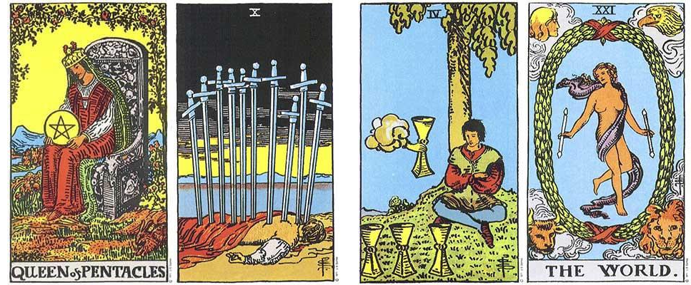 On the lowest level, which could connect to their superficial consciousness or physicality, they have a similar setup of mirroring as the previous set, but it’s much more cut and dry. First, I was seeing the Queen of Pentacles on Connor’s side to be reflecting the angel in Riches, with her coin or pentacle being a physical or more tangible version of the wheel and star in the image of Riches. Just the same, I was seeing the man in the 4 of Cups on Hudson’s side to be reflecting the little green guy in Concentration. In that way, I was seeing the focus and concentration of the Queen of Pentacles to be a conscious or physical level reflection of the efforts for order on Connor’s side, while the more playful or detached energies on Hudson’s side coming into how the man folds his arms and closes his eyes — it’s like he’s not taking it as seriously, but obviously, he’s still getting his cups. Either way, both of them are shown to be sitting, heads bowed toward their pentacle and cup.