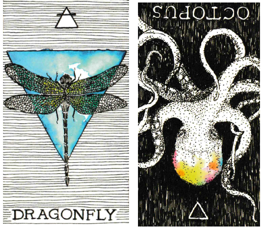 Basically, as I’m seeing it, the Dragonfly, which is ruled by Air, is being asked to dive down into the Water below, while the Octopus, ruled by Water, is being asked to rise to the surface, to rise into the Air, in its reversed position. Similar to the Sea Serpent and the Snake, Connor’s is more in the light while Hudson’s is more in the dark, and they’re being asked to trade.