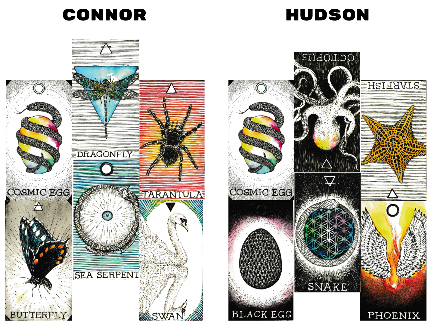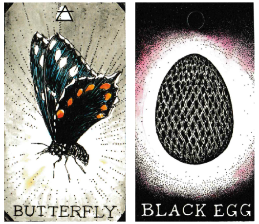 This is also very interesting and could play off of the previous set, their Fire Alignments, because it literally looks like they’ve swapped energies here. In the previous set, Hudson had the rebirth/evolution/alchemy type energy with the Phoenix, while here, Connor has it with the Butterfly. Then, Connor had the more self-contained, smooth-flowing but still very high-up creative expression and flow with The Swan, which Hudson is now projecting here with the Black Egg.