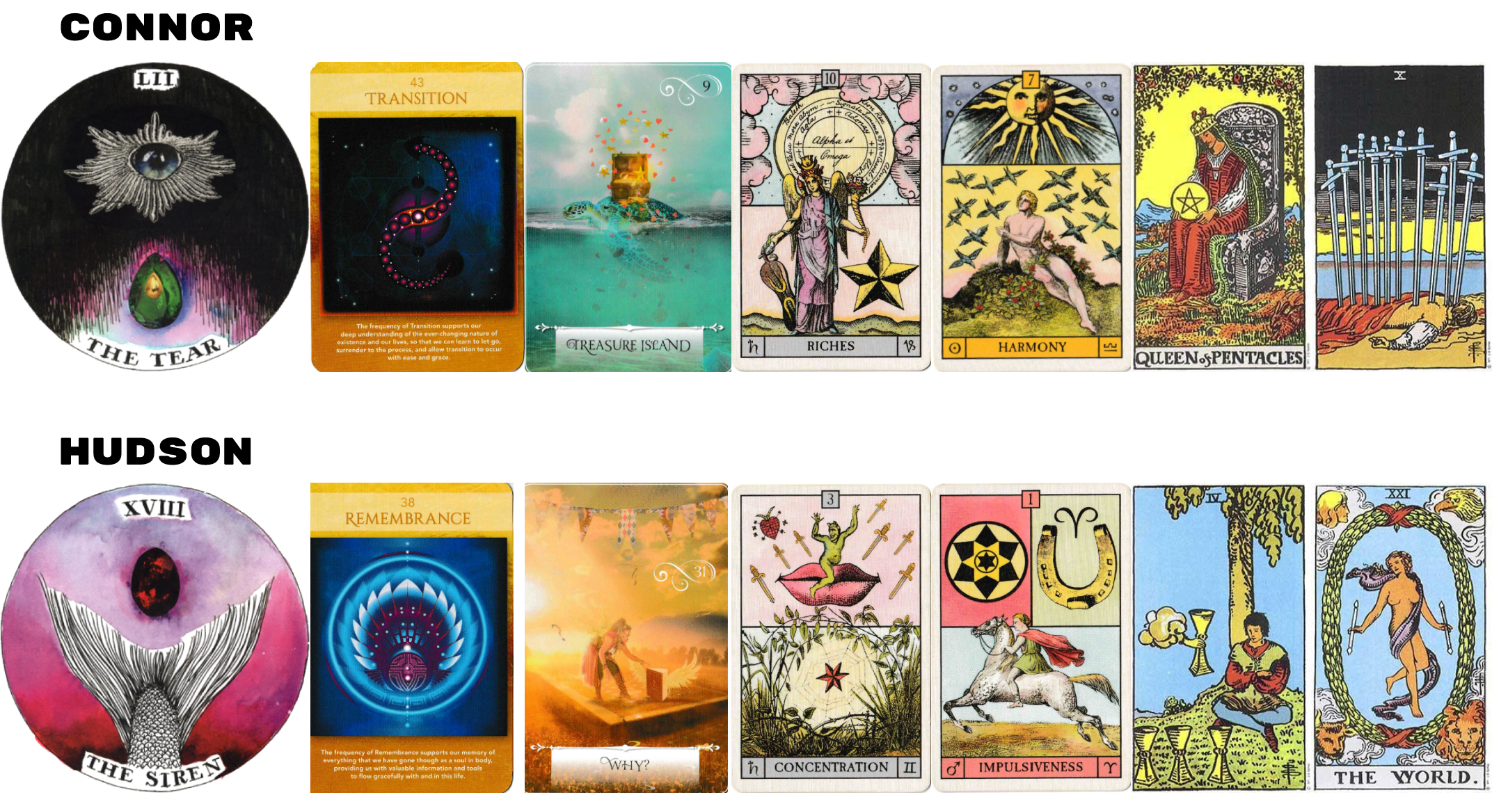 This set really excited me because it seems to be reflecting the subconscious projections, or how they hit people subconsciously. Specifically, this is reflecting what I was seeing with Connor being “A Dream” and Hudson being “A Question.”