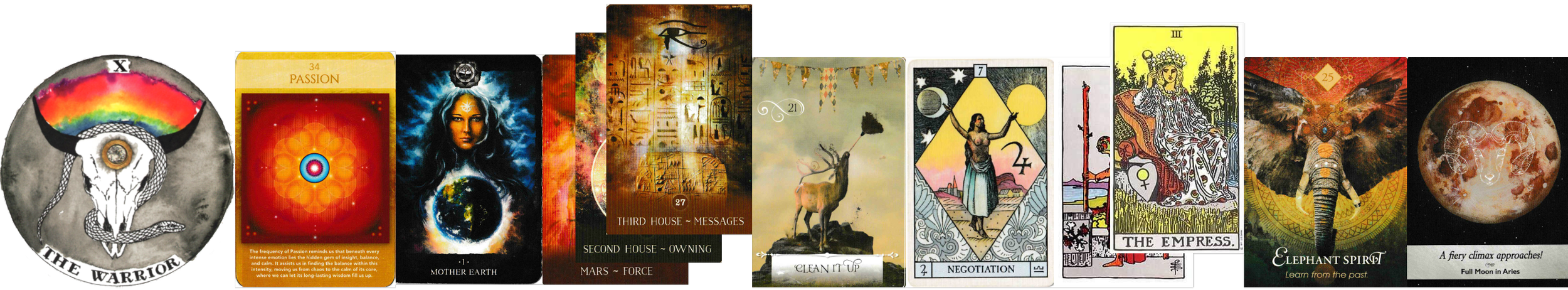 The set above is split down the middle by Clean It Up, and from there, the surrounding cards mirror each other end to end. First, The Warrior mirrors the Full Moon in Aries card at the end, both holding the images of horned animals and really pushing that sense of focused action and conscious/physical level readiness and exertion. Following that, Passion leans over into the Elephant Spirit where it feels like an extension of The Warrior/Full Moon in Aries, but higher up, more centered in the soul or his higher energy. This shows that on both levels, physical and energetic, he is very amped up and ready to go. I know he said he was already packed and ready to leave a month beforehand, so I’m sure this eagerness is quite palpable for him.