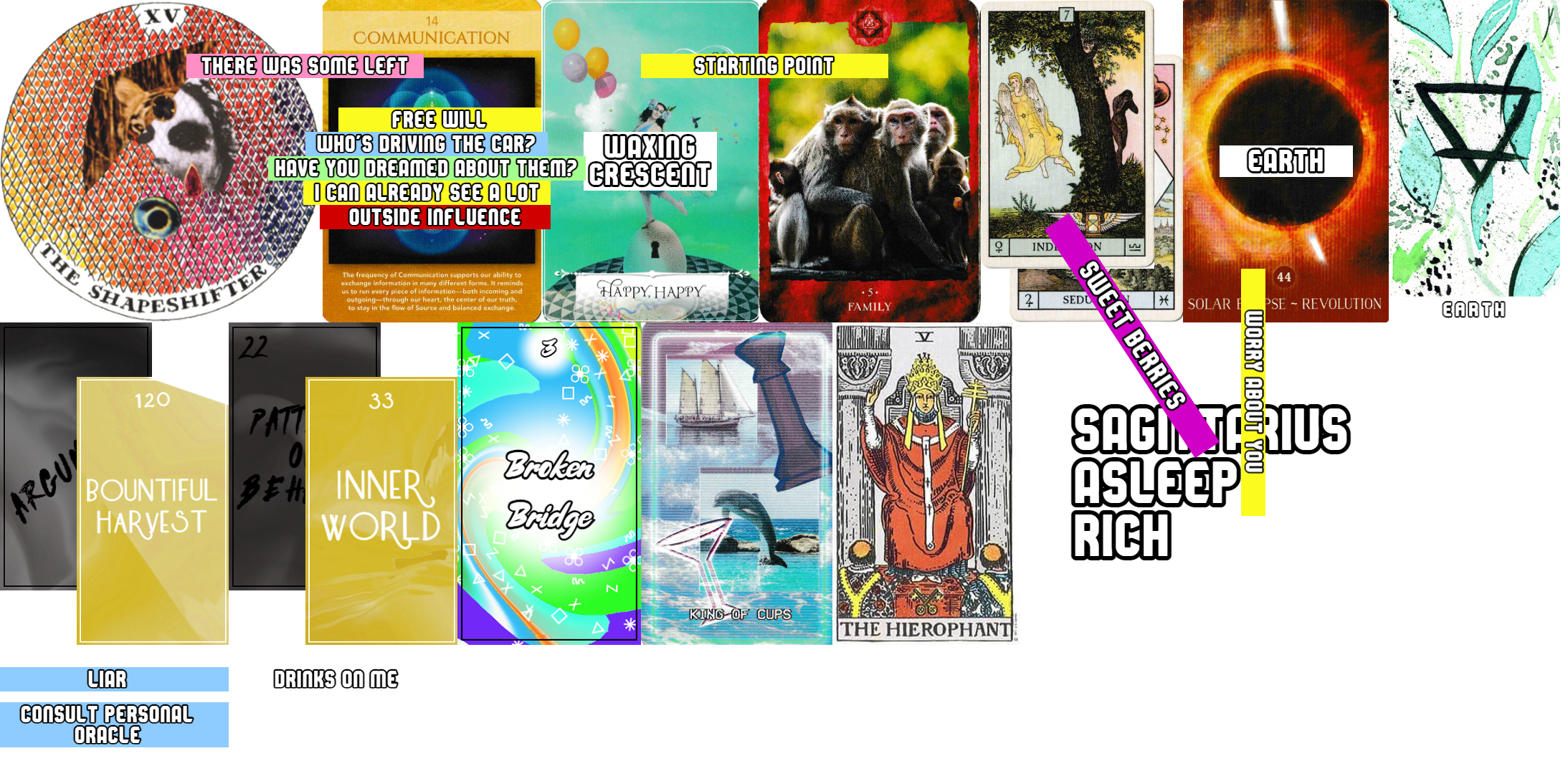 Underneath Bountiful Harvest and Arguments, he has “liar” and a prompt Sprinkle that says, “consult personal oracle,” which is referring to my BlueMoonPunch oracle deck. These are the cards that came out for him here: