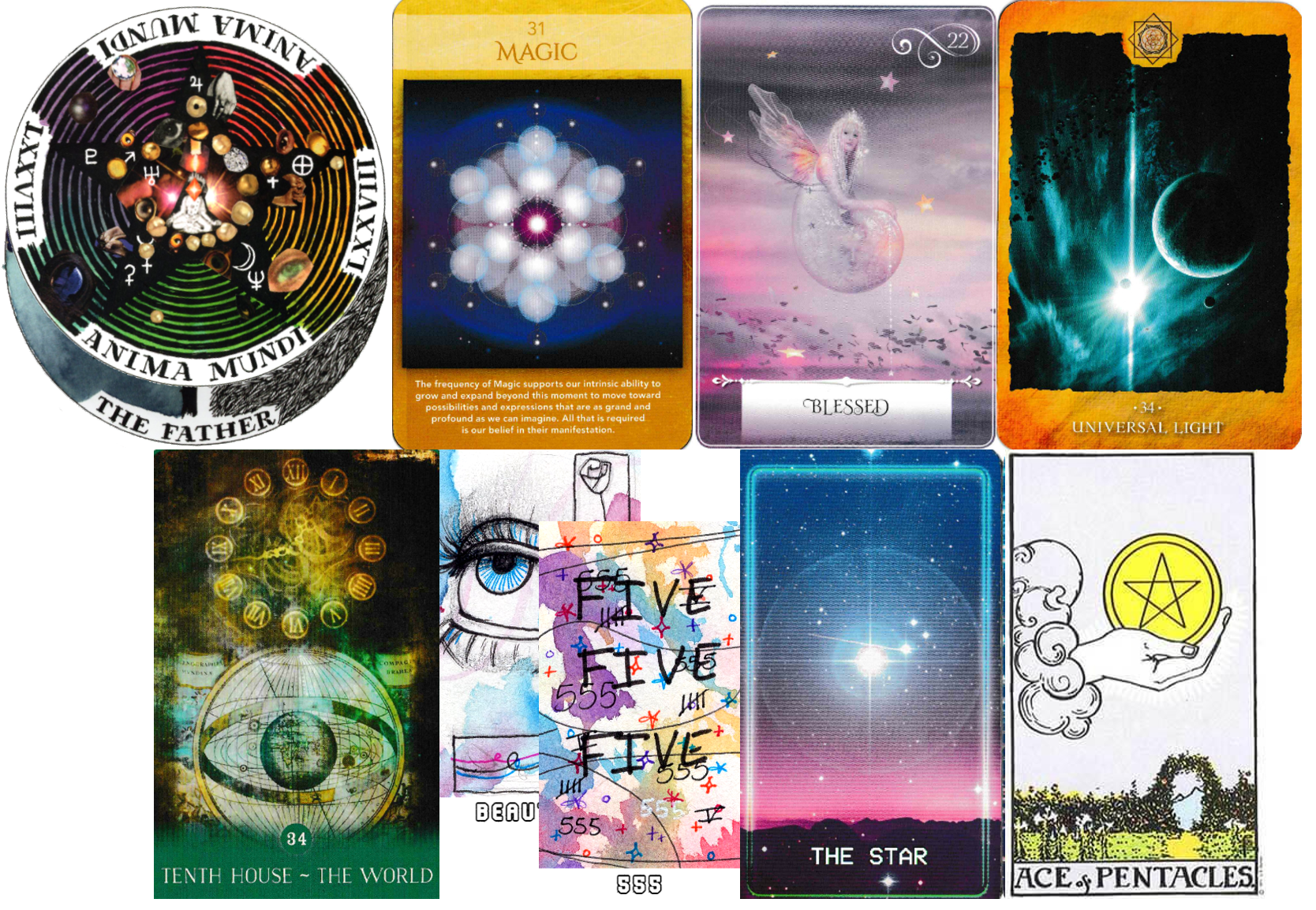 This section is just to look at his overall projected energy right now and going forward post-enlistment through the lens of the cards themselves, looking for either verification or elaboration of what I was seeing regarding his inner world or the space where his soul meets his layers of consciousness. Right away, the first set of cards out seemed to perfectly reflect the element of “precursor to The Big Bang” that I was seeing with Anima Mundi and The Father.