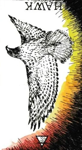 “Hawk — watchful, all-seeing, messenger of divinity, sees clearly, intuitive — The sharp eyes of the Hawk watch our every move. This keen-eyed bird has the ability to see every little detail as well as the bigger picture. When this card appears, fate has its eyes on you, and the winds are shifting. It is said that the hawk carries new upon its wings and is sent from divinity itself to deliver it. The message should not be taken lightly… though it may seem small or insignificant, it will eventually redirect your course.”