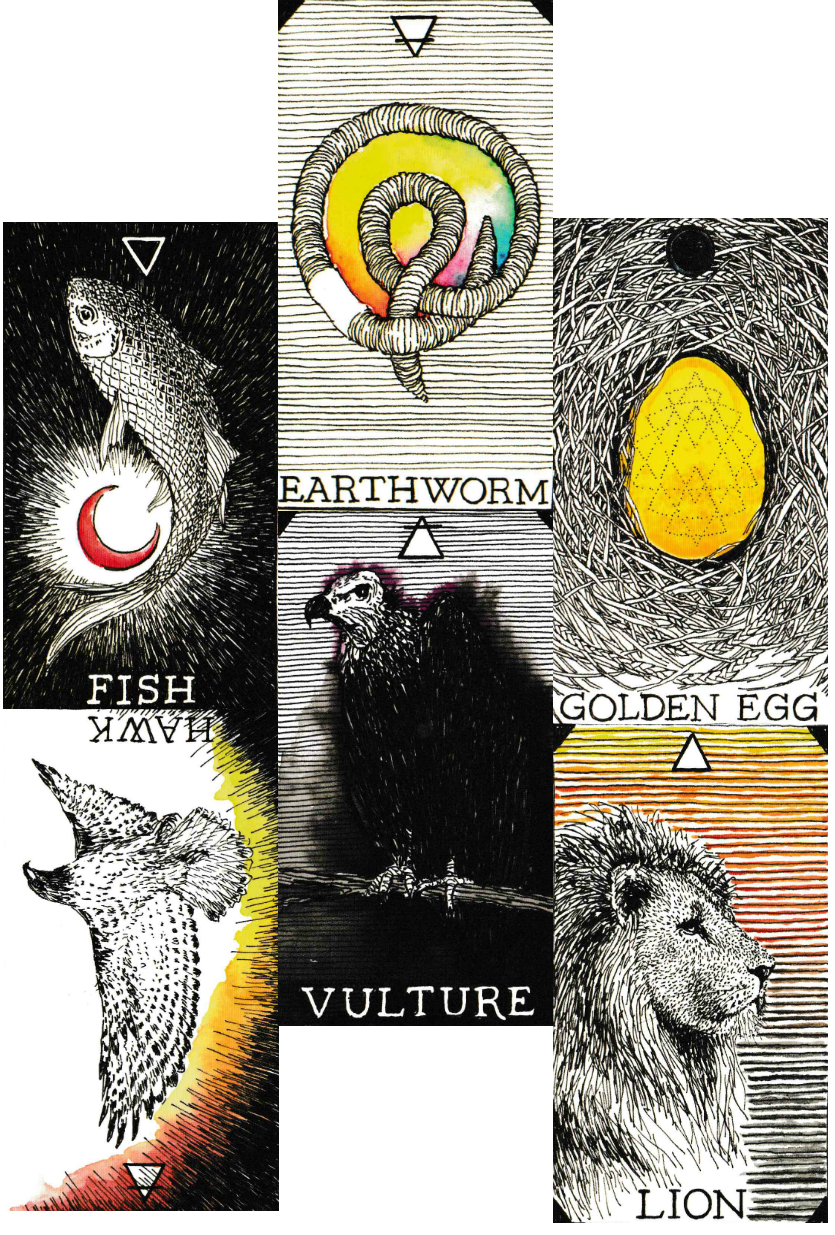 Connecting in an interesting diagonal pattern, those three pink Sprinkles relay the center as being motionless while two outwardly projected spaces, Air and Fire, are active and stimulating each other. Lining things up with the idea of someone being in a car, the Vulture, Lion, and Fish are all technically passengers, but they hold, on a higher level, representations of the navigation system or operator (Vulture), the gas or engine making the vehicle move (Lion), and the road itself, the outer current that the car is following (Fish.)