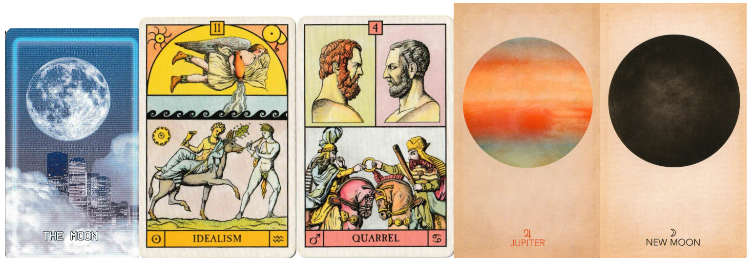 I feel like that was something he was meant to ponder on in his time away, but even now there’s still a lot of back-and-forth within himself. Showing the Sun and the Full Moon at the same time would be quite interesting as we would see a truly dualistic person shining, but both the Moon and Sun are “popped” by Mars and the New Moon. The visual of this “pop” is more clear between Jupiter, who expands or blows up that bubble (could relate to Libra/7th House conformity and assimilation, pleasing others by distorting your own personality), followed by the New Moon card where it appears as if the blue and orange of Jupiter’s image have flooded out and left a void behind.