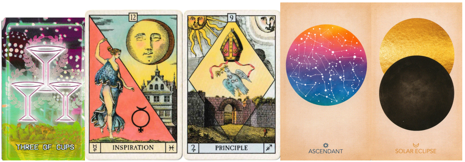 Three of Cups + Inspiration (Mercury in Pisces) + Principle (Jupiter in Sagittarius) + Ascendant + Solar Eclipse