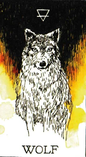 One of the keywords for this card are, “guardian of the family and tribe.” This is where that strong foot is. He’s strong in this, he has a strong backbone, because he knows that even while he is focused on himself and his solo work, he is spearheading the group, he is their representative. I think that avoidance of pollution is the same where he wants to avoid getting involved with drama specifically so that it is not expected that anyone else would be involved as well. There’s a very strong mindfulness here that spreads out from the Horse into the Wolf. It’s a split in his own energy, but one that seems to fan it out rather than divide it and have it operate against itself.