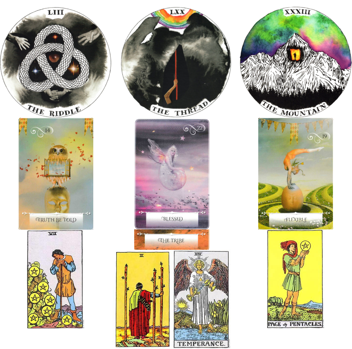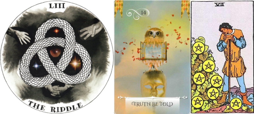 On a conscious level, these projections fall into the 7 of Pentacles, which felt like a state of contemplation. The man is staring down at the growing bush, meant to be waiting patiently for the right time to harvest his pentacles. For Connor, this feels more like an observational assessment of the world, particularly of his own contributions, his own seeds planted, what he has to offer, and what it all can offer him in return. It’s almost like there’s a quiet but constant state of questioning and exploration occurring inside of him, trying to figure out how everything comes together. The image of The Riddle reflects the imagery of the tangled vines and foliage in the 7 of Pentacles while Truth Be Told, the subconscious space, the intuitive, creative, and emotional space, is where things are untangled, unmasked, and understood through a lens of exchange of cause and effect.