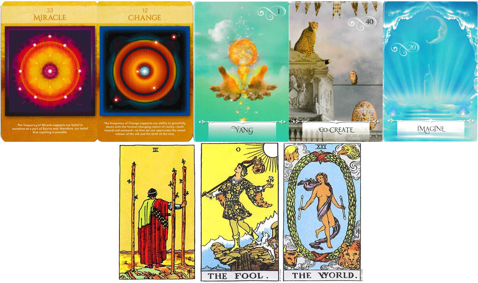 Miracle + Change + Yang + Co-Create + Imagine + 3 of Wands + The Fool + The World