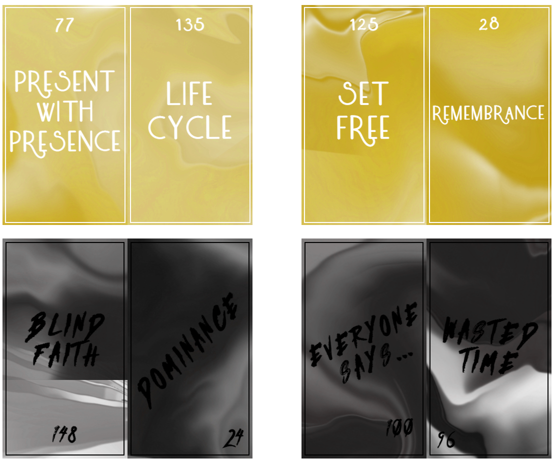 This next set shows their progression, something that kind of elaborates on the previous. Starting with Flirtation, we have the kick-off of the connection, starting as flirty friends, highlighted in a connection of music and performance. Companionship is the establishment of the connection. I’m seeing it being hidden though, as if the two hands joined down below are theirs, while the figures above are friends or close people who also stood to protect or help keep the connection private.