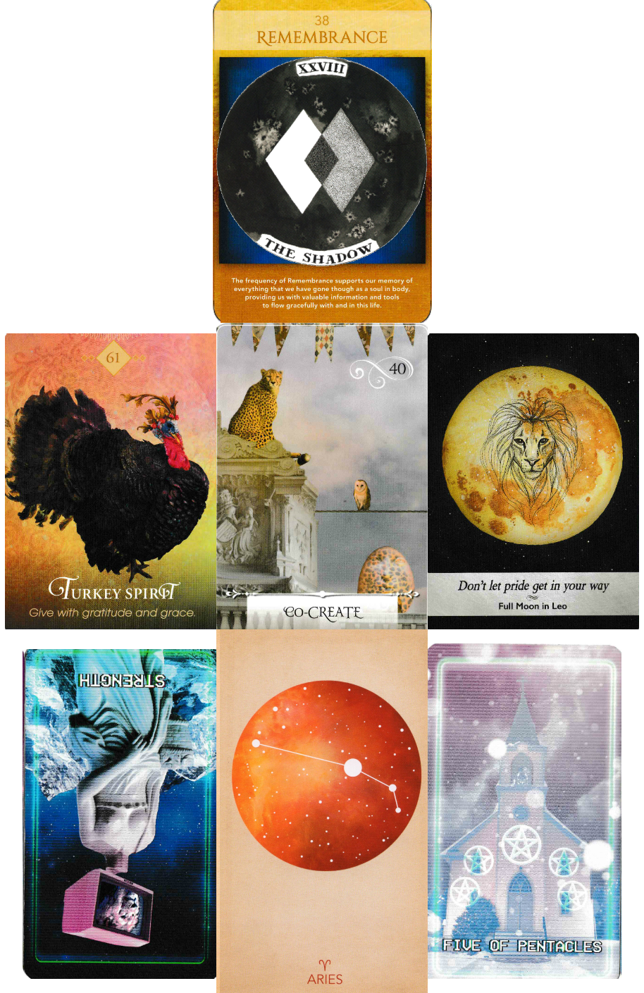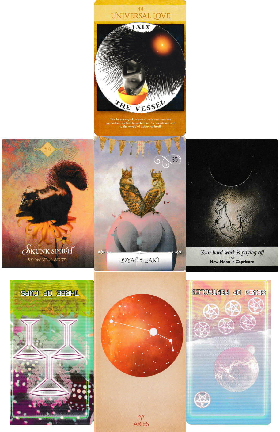 Deck: Sacred Geometry Activations by LON, Moonology Oracle Cards by Yasmin Boland, Spirit Animal Oracle by Colette Baron-Reid, Angelarium: Oracle of Emanations by Eli Minaya and Peter Mohrbacher, Wild Unknown: Archetypes by Kim Krans, Chakra Reading Cards by Rachelle Charman, Rider-Waite Tarot, Tarotwave by McKenna Calabro, The Arcana of Astrology by Claire Goodchild