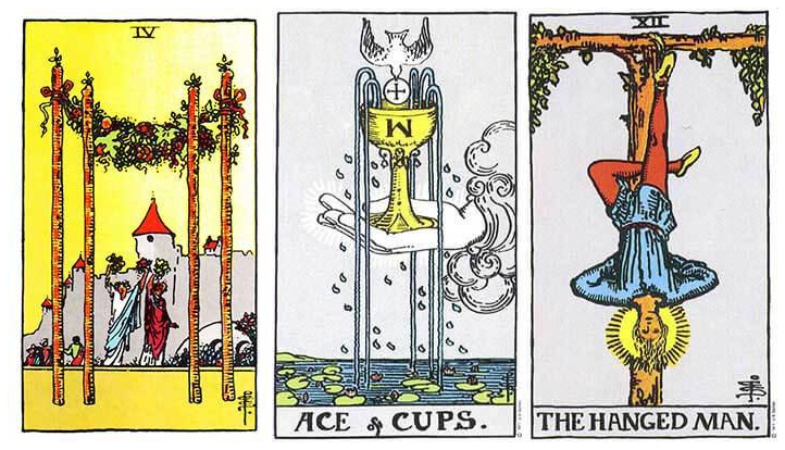Jimin — 4 of Wands, Ace of Cups, The Hanged Man