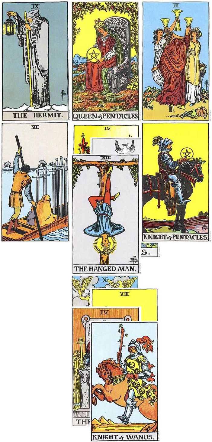 Not surprised at all that Kook is completely made of Fire here and seems very eager to hop on that Wheel of Fortune and see where it takes him. Strength, The Emperor, and the Knight of Wands all scream personal authority, validation, creative freedom, expression, and action. Strength represents that inner strength, that personal validation that he’s given to himself by, in a sense, conquering major aspects of his self-perception and insecurity. This inner strength is what gives The Emperor his power, his rulership, and authority. This is Kook’s center at the minute. The Emperor is very clear in his vision and very commanding of action. Then, of course, the Knight of Wands, fire on fire, is the more externalized aspect of Kook, the Knight who takes the missions, plans, ideas, and visions of The Emperor and executes them with every last bit of will and determination he can muster.