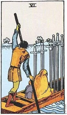 On the other end, however, the reversed 6 of Swords can also indicate that the same kind of transition is occurring but more internally, more spiritually. You can imagine this reversed card as a moment in which the water, a symbol of the internal space, the emotions, intuition, and creativity, beat against the boat so hard that the swords fall down and all that’s left to focus on now is the water itself. From then on, it’s about navigating the water, navigating the currents, rather than looking straight ahead at the what if’s or the land on the horizon. It’s just about keeping the boat steady and making it to wherever in one piece.