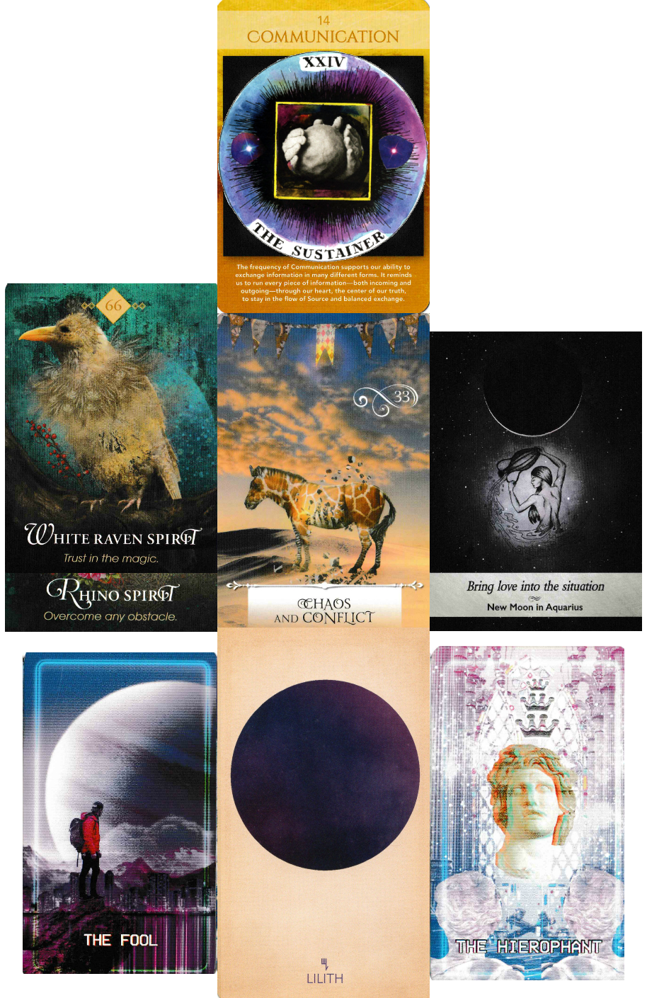 Alongside the White Raven, his external guidance also presented the Rhino Spirit which says, “Overcome any obstacle.” Again, it’s reassuring and encouraging for a time when Chaos and Conflict are at the forefront of his experience. His internal guidance, reflecting both Communication, the 3 of Cups, and The Sustainer, gave him the New Moon in Aquarius which says, “bring love into the situation.” I think this is quite a fitting reminder or something he will have in him, patience mostly, that will help him to navigate, and help others navigate any major problems that come along. Rather than going all Virgo and exacting judgment, asserting his opinions and feelings over everyone else’s, he would instead be an open source for balance and understanding, a conduit of conversation.