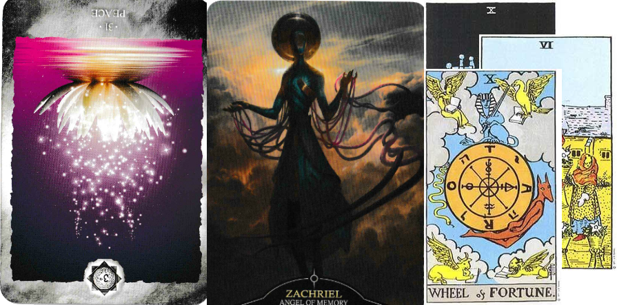 PEACE (REV.) + ZACHRIEL — ANGEL OF MEMORY + 10 OF SWORDS WITH 6 OF CUPS AND WHEEL OF FORTUNE