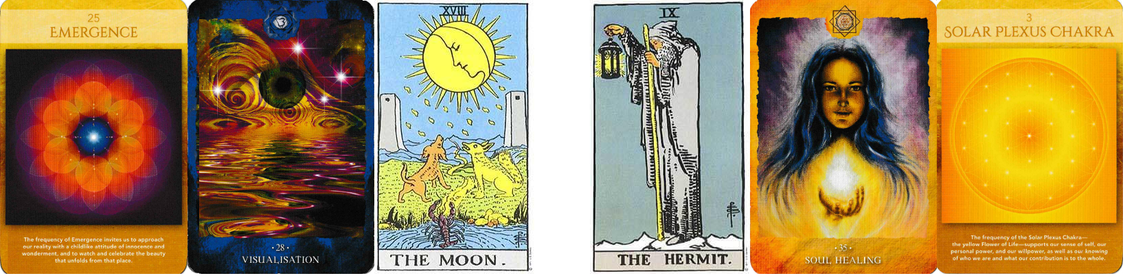 On the far right side, Soul Healing and the Solar Plexus, which lines up with the center of self, the expression or projection of the soul, feel to be descending into The Hermit. I see the entirety of the Solar Plexus card as not the entirety of Taehyung’s soul, but his own essence, his own inner light, something I’m seeing more as his heart or his inner calling. It is grabbed onto by an aspect of the subconscious space, something that maybe would have been his Ego, but a prideful Ego, an Ego that would want to expand and seek outward, and held light a light that I feel illuminates the conscious mind, inspiring the conscious level to seek inward. This light then extends to The Hermit’s lantern, which he is using to look “inward” toward his Moon, toward the emotional center first, which would then lead into the creative, and then the intuitive, which would give him space to potentially connect consciously to the soul or the higher unconscious.