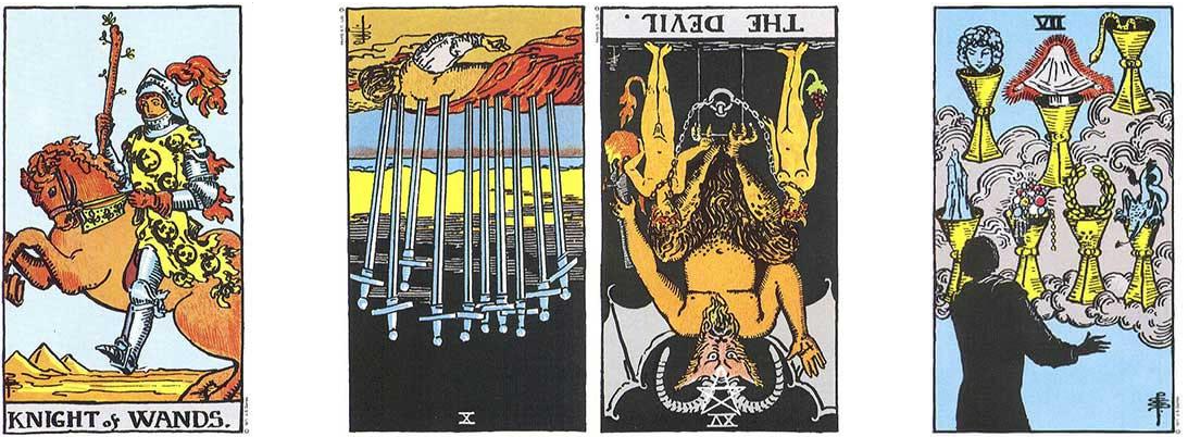 Knight of Wands + 10 of Swords (rev.)/The Devil (rev.) + 7 of Cups