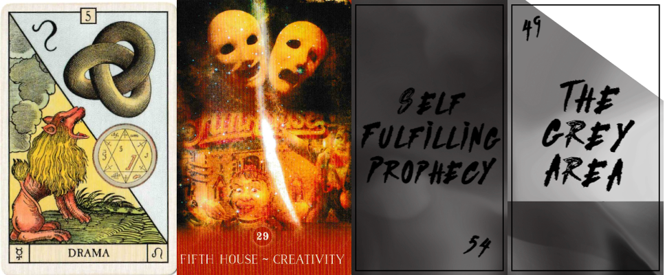 This next set is very interesting because, again, we’re seeing that split displayed with Drama and the 5th House. I find this very interesting because these both bring focus to the 5th House/Leo which is the area where we begin to develop our egos, our masks and costumes, our performances for the world as we learn right from wrong or what is the most acceptable within our environments, stemming off of the 4th House which is where we first begin to learn from the family and homelife. Drama specifically highlights Mercury in Leo, focusing on the conscious mind and observation. In this card, I’m seeing the lion down below being the ego overtaking the conscious level mind, and the knot up above that the lion is roaring at being the soul in its current state. Then, obviously, the two masks, which are “the faces of drama,” comedy and tragedy, also replicate the element of the split soul itself. As I’m seeing, Drama shows the conscious mind or the Ego itself looking at the soul, and the image on the 5th House representing the soul itself in its split state.