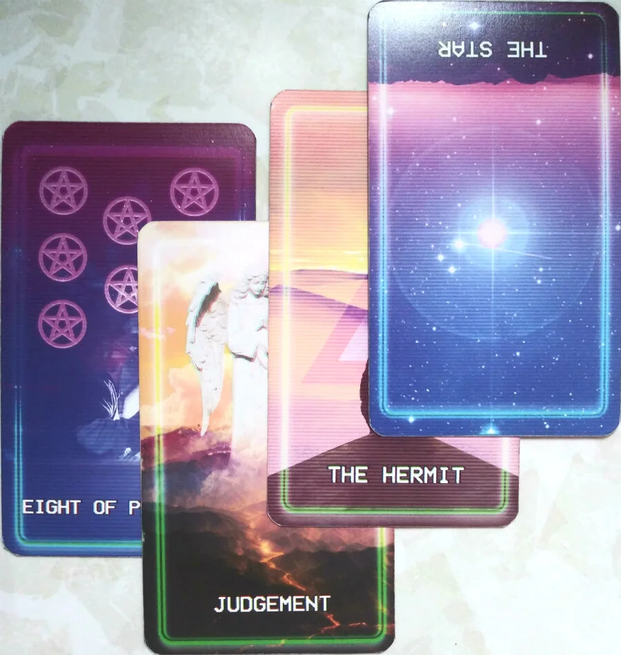 The next three cards are kind of like the lasting opinion, something that I think would only be taken on by someone who actually watches him or pays attention to him long enough to notice these things. The first card in that set is Judgment, then The Hermit, which is then followed up by The Star in reverse. All of this is literally referring to that thing he does where he just completely spaces out and is just sitting there like O.O, not moving, not even blinking. Like someone new would have to actually watch him to notice that especially if they’re talking to the other guys.