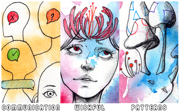 With your oracle cards, you have an interesting message here about mental distortion or an issue where wishful thinking leads to you becoming blind to, or intentionally distorting discernible patterns of negative. With Communication, it’s showing that there is deliberate assessment being applied to people or one person, maybe an observation of your relationship overall, but this Air-centered card (yellow) falls into the space of dreams (red and blue) through Wishful. I see the image of Patterns reflecting Communication where the three people with speech bubbles are turned into the three mushrooms who have the same repeating patterns all over them. This is equivalent to someone picking out one positive trait in another person and using that one trait to cover the negativity of twenty others.