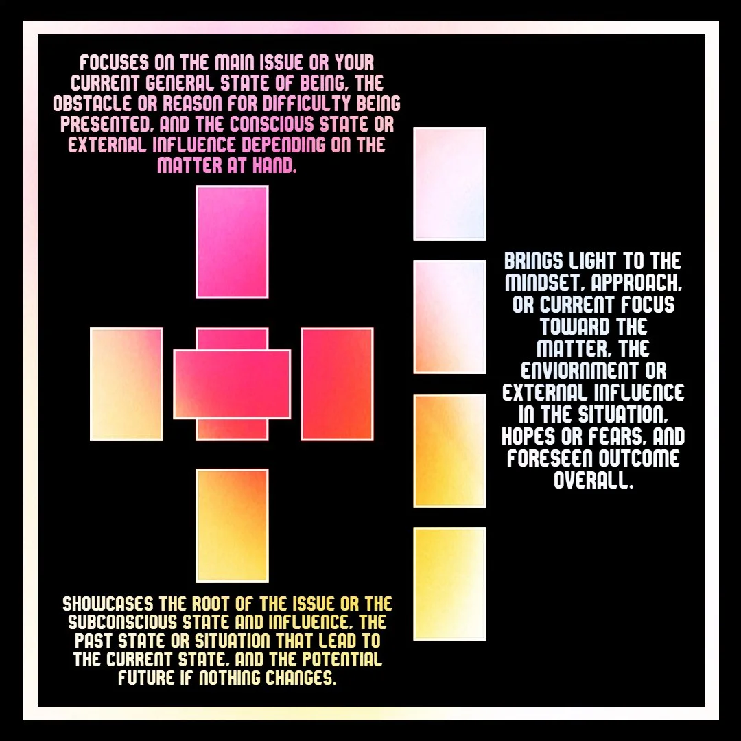 The Classic Celtic Cross is a 10+ card reading that can help you to understand your current state within a situation or problem, providing helpful information that can help you to move past any obstacles you may be facing.