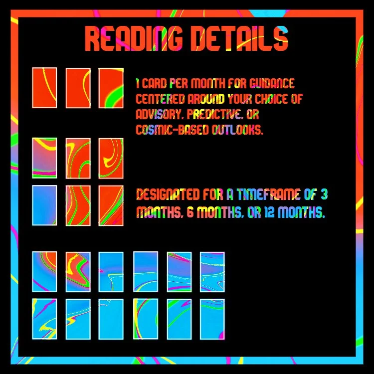 This reading will provide you with a general outlook for the next 3, 6, or 12 months. There are 3 versions of this reading: Predictive, Advisory, and Cosmic.