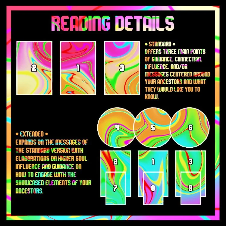 Extended: Adds additional cards to each of the 3 main sets to included additional guidance and clarity, as well as advice or suggestions on how to engage with your ancestors.