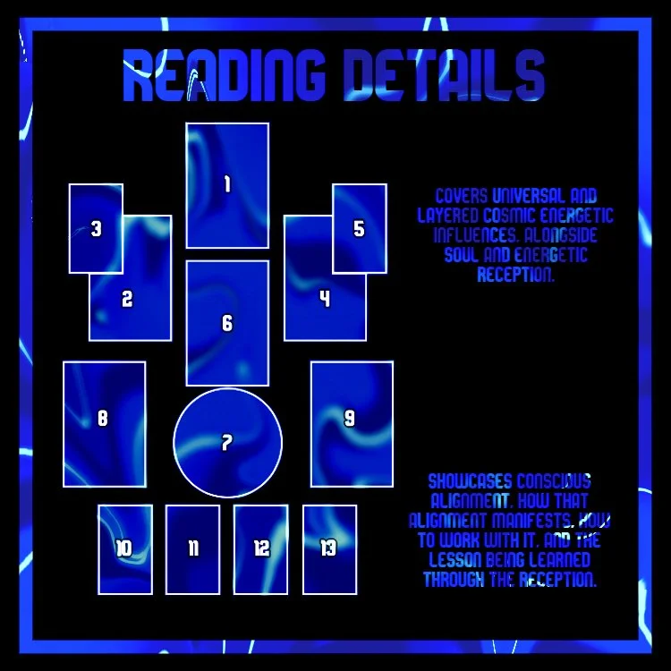 The Cosmic Alignment is a 13+ card reading that is designed to showcase an individual’s personal energetic alignment with cosmic influences. It can be considered an Astrological Alignment reading as well.