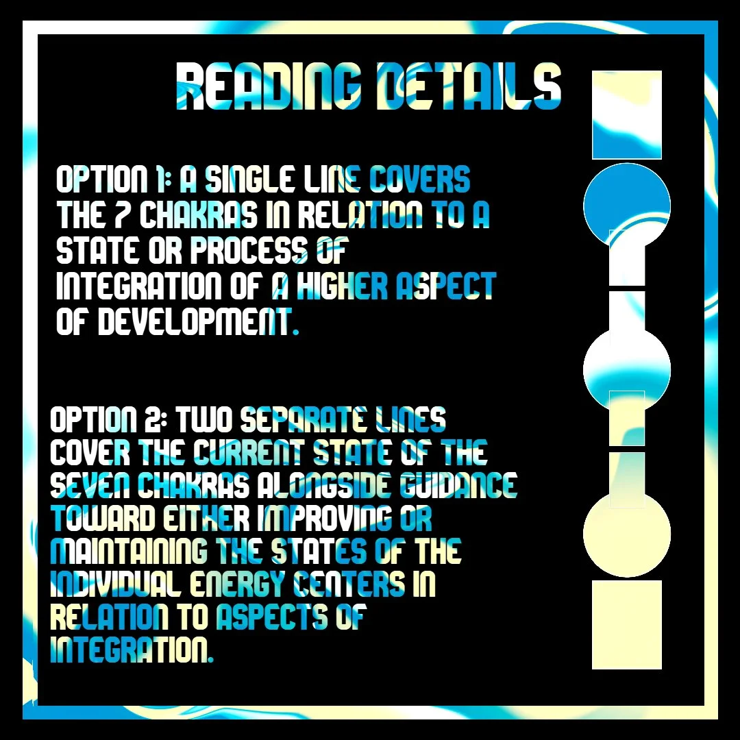 This reading focuses on the 7 main chakras in relation to a state or process of integration of a higher aspect of guidance or development.