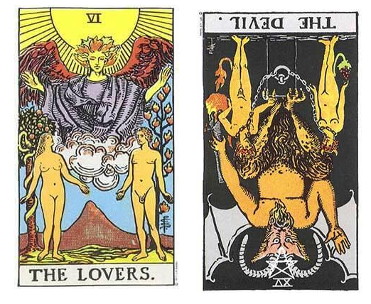 Lastly, this set is probably the most significant as it would surely be a message for everyone. The Lovers with the reversed Devil is a potent combination as The Devil card itself is an inverse of The Lovers, featuring an ever so slightly corrupted Adam and Eve chained to the pillar under the Devil. As always, I never look at The Lovers as being anything at all to do with love or with more than one person. The Lovers represents personal alignment with each character featured representing a level of awareness — Adam is the conscious mind, Eve is the intuitive and receptive subconscious mind, and the Angel is the unconscious mind or the Higher Self. Adam looks to Eve, Eve looks to the Angel, and with this, they represent an individual in full alignment. But what about The Devil?