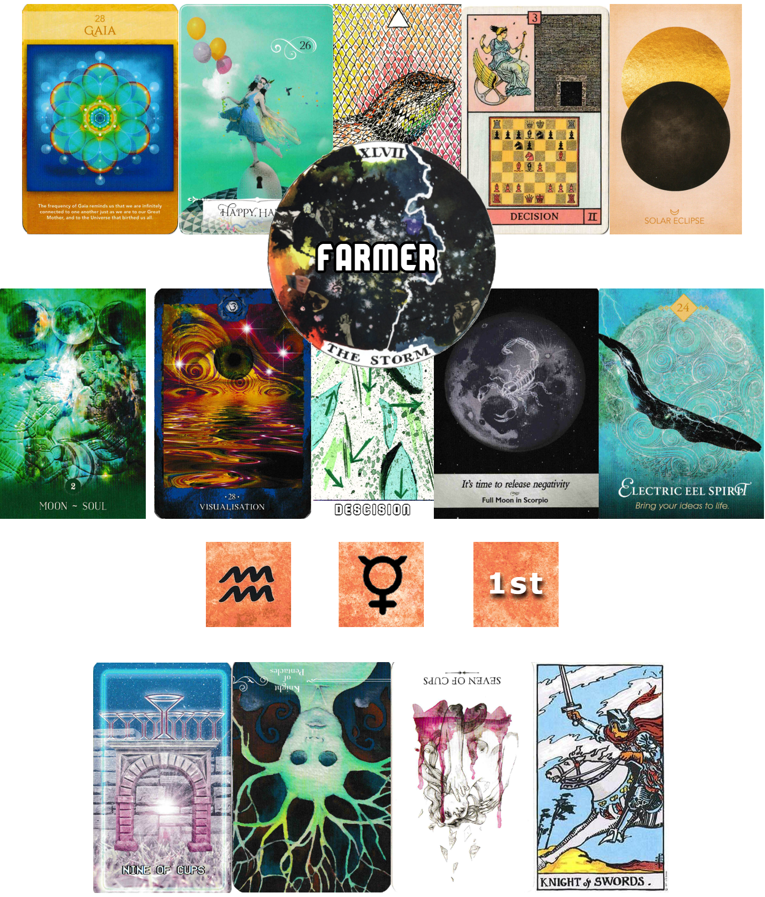 At the very center, the word FARMER lays over The Storm which already paints an interesting picture of the general collective energy that will be at play throughout Leo Season. On one hand, The Storm spells out trouble for the Farmer as plans for the initial plowing and planting of the fields are affected by the sudden change in weather. For other Farmers in Leo Season, this storm, though sudden and loud for everyone equally, suggests refreshed and rejuvenated soil that will only support and amplify the growth of the desired harvest going forward. For everyone, Leo Season will mark some kind of wake up call or check point of clarification all for the sake of locking into place some of your steps for the journey forward.